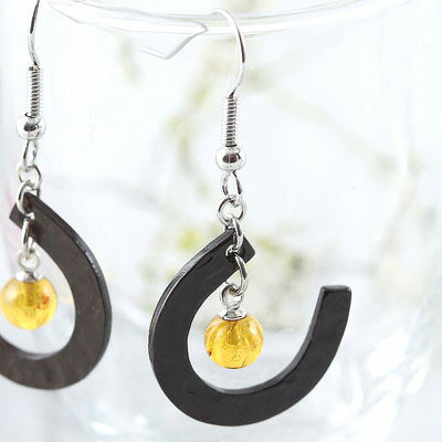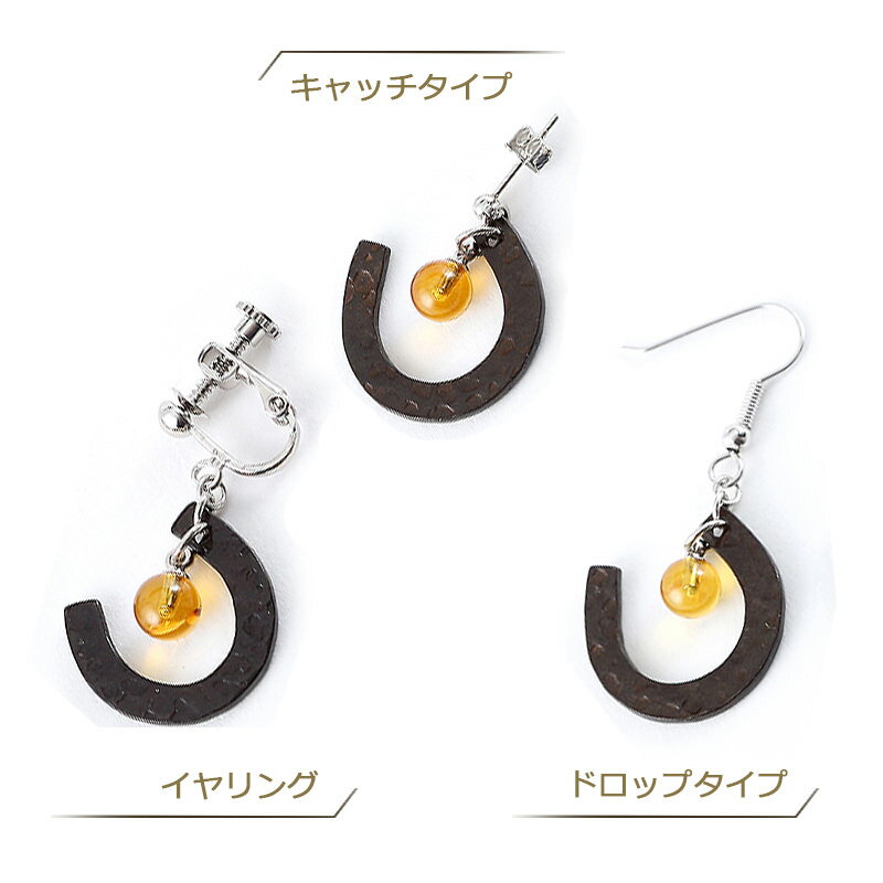 南部鉄に岩手ならではの琥珀が揺れる馬蹄型ピアス/イヤリングです。