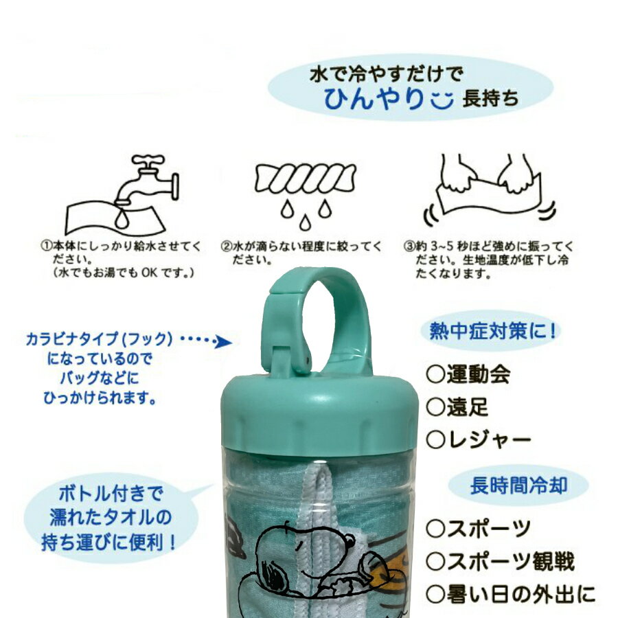 キャラクターひんやりタオル スヌーピー グリーン 接触冷感素材 熱中症対策 持ち運びに便利なボトル入りパッケージ バッグにつけられる 水で冷やすだけでひんやり感が長持ち! 暑さ対策・熱中症対策に! ボトル付きだから濡れたタオルの持ち運びに便利。