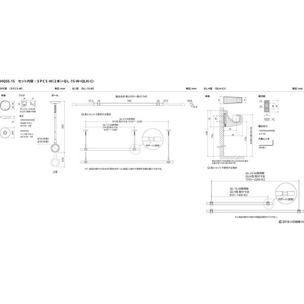 □セット内容:SPCS-W(ショートタイプ)×2本、QL-15-W(950〜1540mm)×1本、QLH-Cr×1セット(2ヶ)、ポール掛けフック×2個 □専用フック(QLH-Cr)の注意点・室内用物干し竿QL型専用フックです。