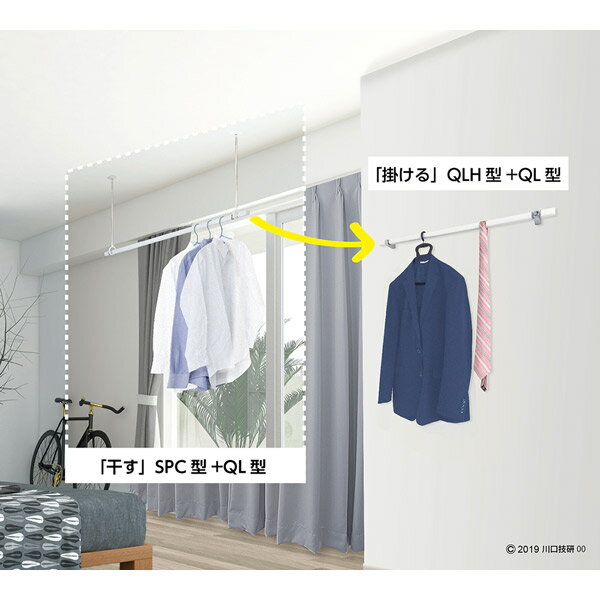 川口技研の一覧はこちら ンSPC型をはじめとした、室内用スポット型に合わせてデザインされた物干し竿とSPCS-W(ショートタイプ)と竿用専用フックのセット品です。