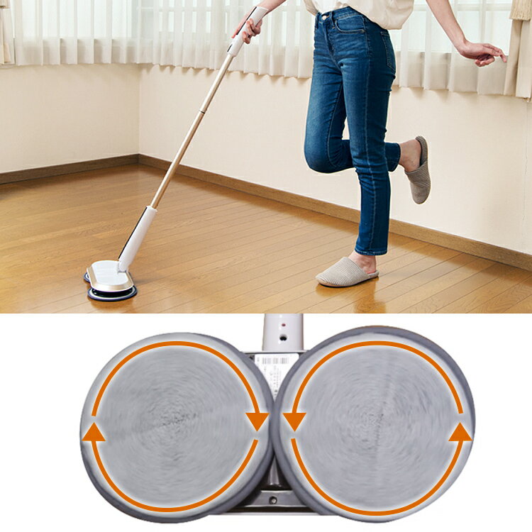 ■本体サイズ(約)幅29×奥13.5×高さ104cm(本体のみ)■重量約1.0kg(充電式バッテリー含む)■充電器入力:AC100V 50/60Hz出力:DC7.5V/500mA■充電池リチウムイオンバッテリー 7.4V■運転時間約60分(モップパッド乾燥時)■充電時間約3.5時間■ACアダプターコード長約1.5m■付属品ACアダプター、モップパッド(2枚)トルクアップにより掃除除去性能アップ!コードレス回転モップクリーナーは、「電動ツインヘッド」が2つのモップパッドを1分間に130回転させるから、床のひっかかりがなく、自走する力も生みます。