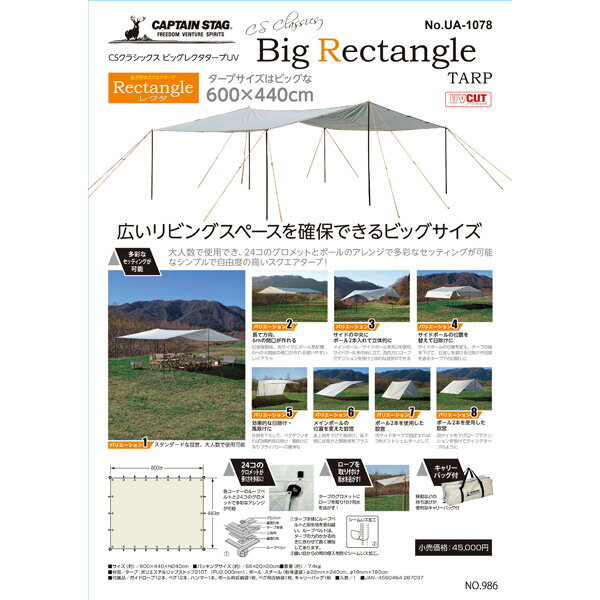 CAPTAIN STAG(キャプテンスタッグ)の一覧はこちら幅6000×奥行4400×高さ240mm重量7400g材質:タープ:ポリエステルリップストップ210T(PU2000mm)ポール:スチール(粉対塗装)パッキングサイズ/66×20×20cmポールサイズ/φ22mm×240cm・φ19mm×180cm付属品/ガイドロープ12本、ペグ12本、ハンマー1本ポール用収納袋、ペグ用収納袋、キャリーバッグ1枚大人数での使用でき、アレンジ次第で自在で多彩なセッティングが可能。