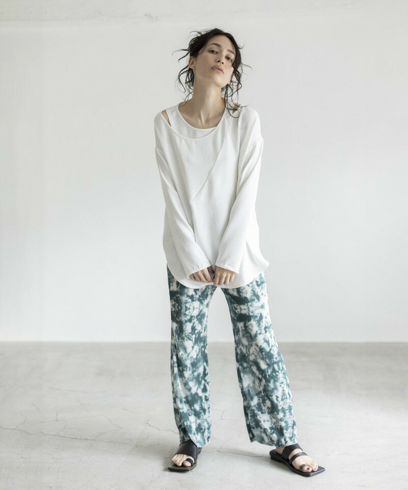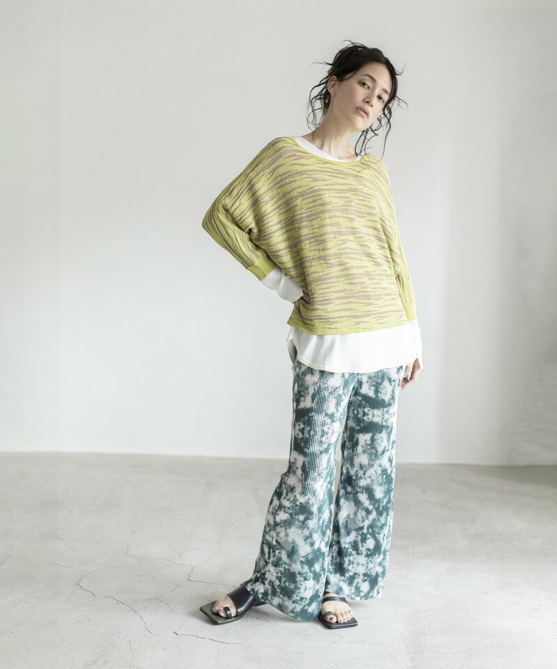 [型番:593006-890P]ワントーンのタイダイ柄で夏らしさの中にもクールな印象のセミフレアーパンツ。