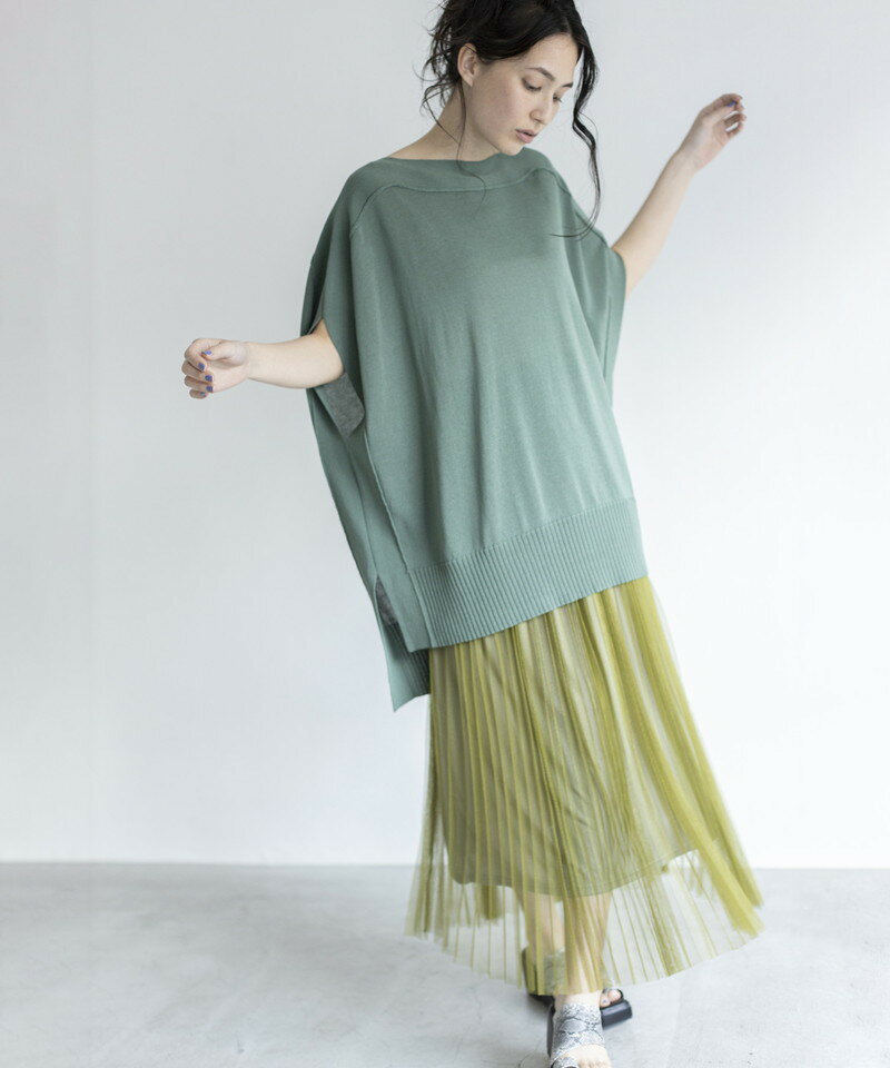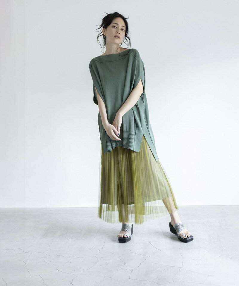 [型番:593010-875S]定番のプリーツスカートも、春らしいチュール素材とシアー感が新鮮な雰囲気に。