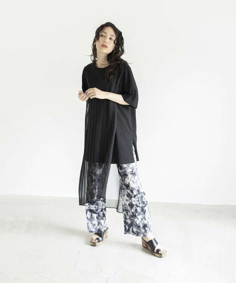 Tシャツにアシンメトリーのシアープリーツをドッキングしたアイテムは、360度見る角度によって表情を変えるこだわりのデザイン。